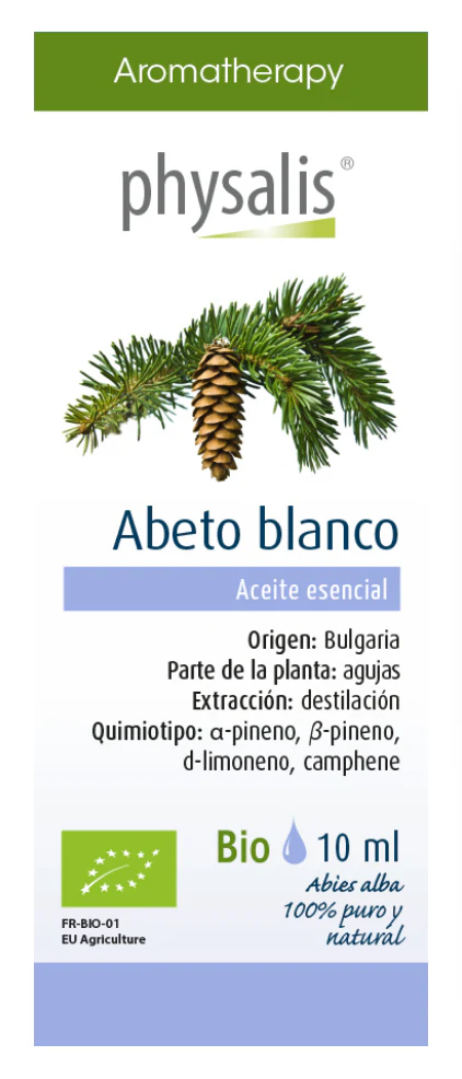 El aceite esencial de abeto blanco exhala un aroma fresco de resina. Es un aceite ideal para difundir en el ambiente para purificarlo y ejercer un efecto emoliente en las vías respiratorias (en caso de estancamiento de moco y congestión de los bronquios). En el masaje, estimula la circulación sanguínea y alivia el dolor muscular.