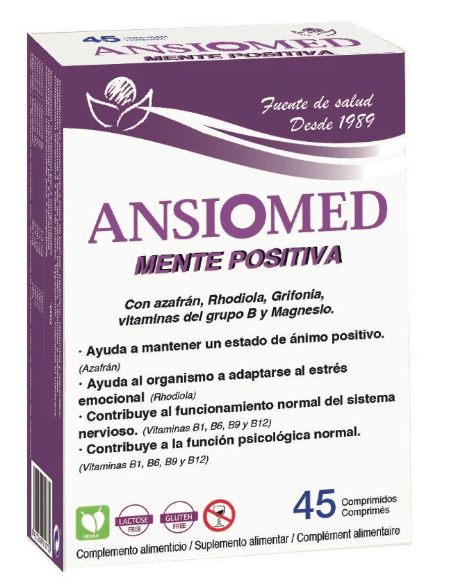 Ansiomed Mente Positiva es un complemento alimenticio que nos ayuda a mantener un estado de ánimo óptimo, a adaptarnos al estrés emocional y al funcionamiento normal del sistema nervioso.