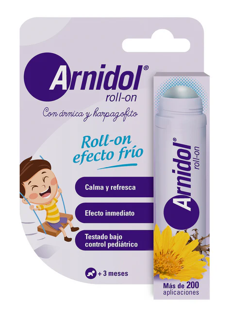 Arnidol® Roll-On, gracias a su formulación con ingredientes de origen natural, a base de Árnica y Harpagofito, calma y refresca la piel tras los pequeños golpes de los niños y aporta un efecto frescor gracias a su nuevo formato Roll-On con bola metálica.