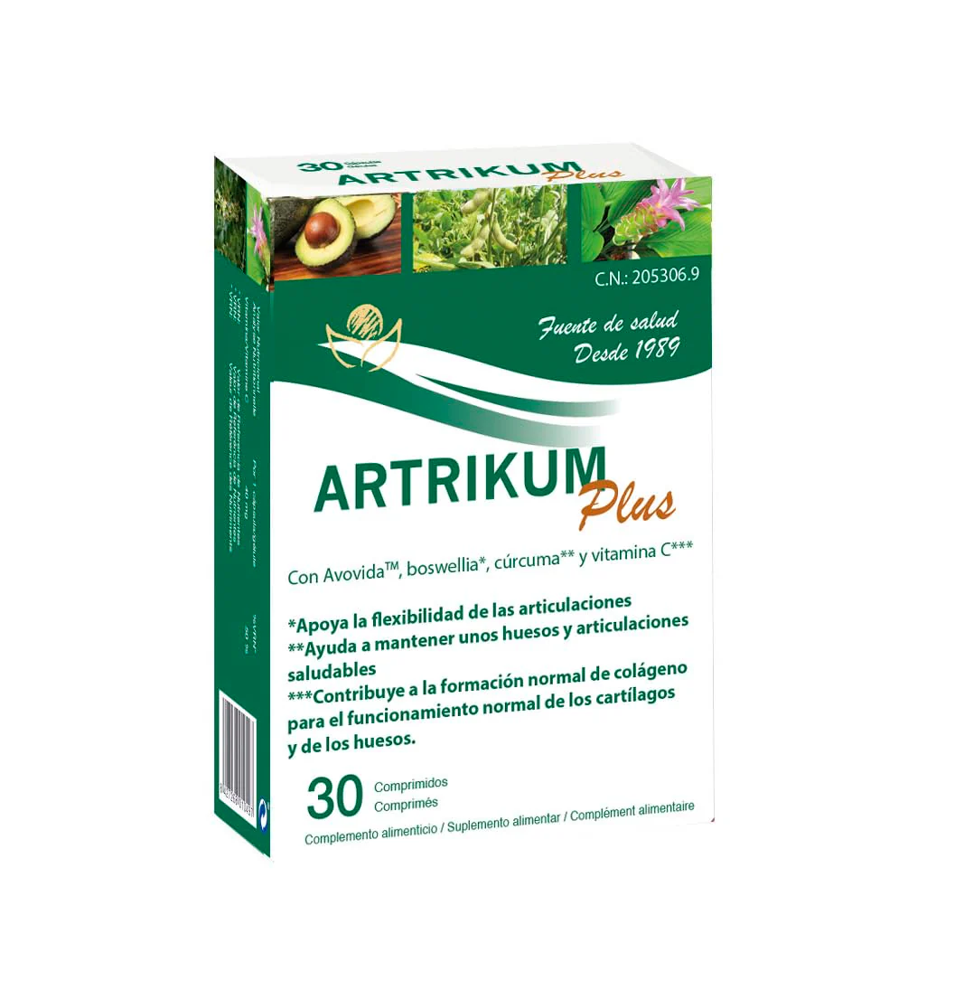 Extracto de aguacate y soja en insaponificables (AVOVIDA™) 300 mg, extractos nebulizados estandarizados de cúrcuma (Curcuma longa L.) 100 mg y boswellia (Boswellia serrata Roxb. ex Colebr.) 100 mg, ácido L ascorbico (vitamina C) 40 mg, silicio procedente de bambu (Bambusa vulgaris), 25 mg, agente de carga (celulosa microcristali-na, aerosil), antiaglomerante (estearato de magnesio), agente de compresión (compritol).