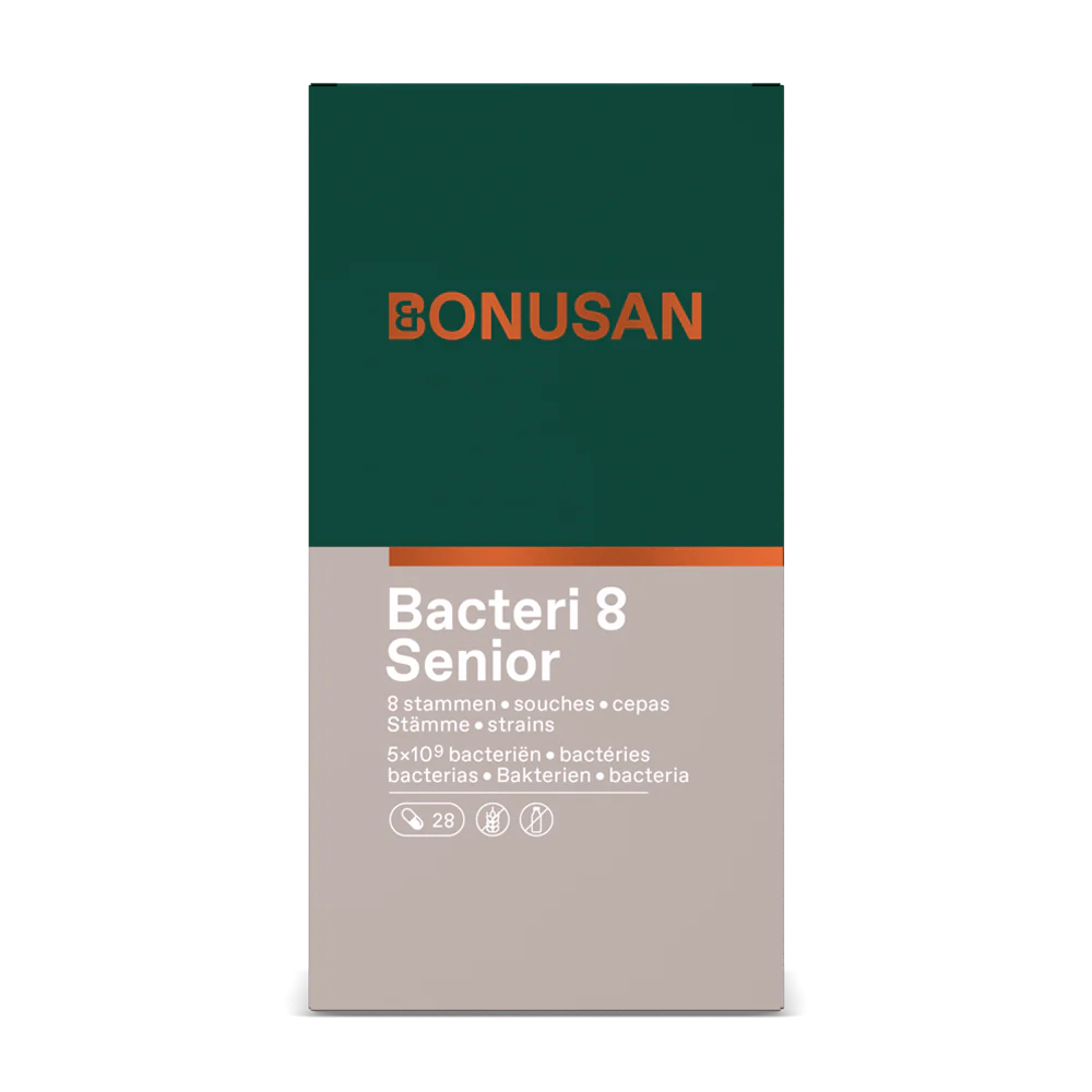 Bacteri 8 Senior de Bonusan ofrece una mezcla equilibrada de 8 cepas bacterianas formulada especialmente para personas de edad avanzada. Sabemos que, a medida que la edad avanza, la cantidad y diversidad de bacterias en el microbioma disminuye. Las cepas bacterianas de este producto están adaptadas a las bacterias que existen de forma natural en el microbioma de las personas mayores.