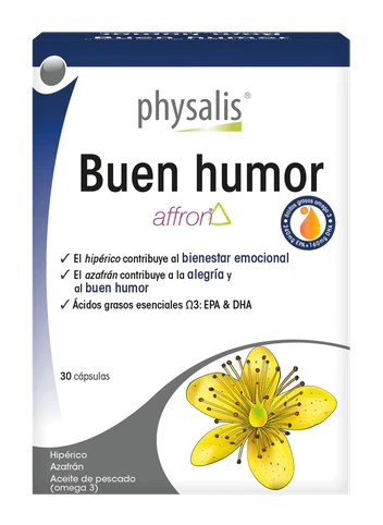 ¿Un momento crítico? ¿Hipersensibilidad a los cambios estacionales? ¿Problemas profesionales o familiares? Algunas circunstancias pueden darnos guerra temporalmente. Physalis Buen humor es un compuesto de alta calidad con extractos estandarizados de hipérico y de azafrán. El hipérico contribuye al bienestar emocional y al sueño. El principio activo del azafrán colabora a un estado de alegría y calma general. Affron® es un extracto innovador que ha sido objeto de tres estudos clínicos avanzados. Se trata de un extracto que contiene azafrán (obtenido a partir de los filamentos de crocus, de variedad española) muy estable y estandarizado por HPLC con >3,5 % de lepticrosálidos®, conteniendo azafrán y crocina. La fórmula es completada por el EPA y el DHA, ácidos grasos omega 3 procedentes de un excelente aceite de pescado.