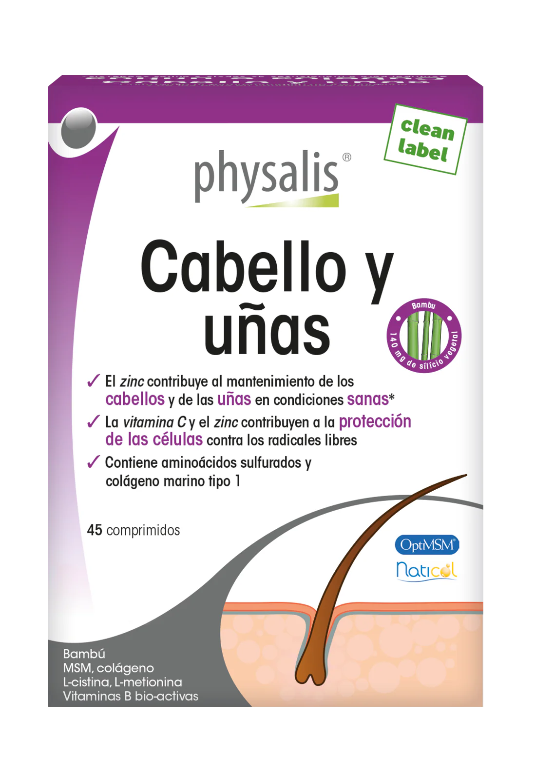 Estrés momentáneo, fatiga pasajera, malos hábitos alimentarios, sol, tintes,… tienen un efecto negativo, que dejan los cabellos y uñas, quebradizos y sin brillo. Physalis Cabellos y uñas es un complejo natural nutritivo que contiene zinc en forma de quelato (biodisponibilidad máxima) que contribuye a la belleza y a la salud del cabello y de las uñas. La biotina (o vitamina H) y la vitamina B6 apoyan el metabolismo de las proteínas mientras que la vitamina C y el zinc participan en la protección de las células contra los radicales libres. Contiene también silicio orgánico del bambú, un hidrolizado de colágeno tipo I (Naticol®), L-arginina, MSM y aminoácidos sulfurados L-cistina y L-metionina.