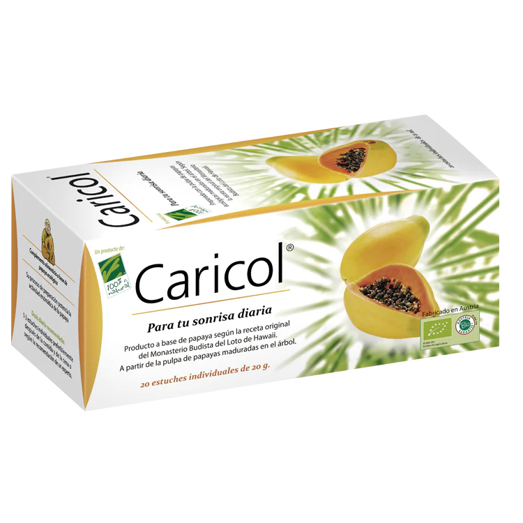 Caricol® es un producto natural, fabricado a partir de la pulpa de papayas maduradas en el árbol, 100% orgánicas, libres de conservantes, colorantes, excipientes y GMS.