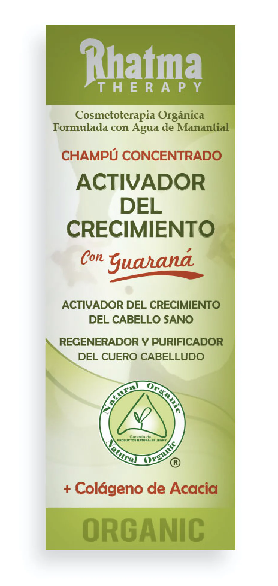 - Activos para el cuero cabelludo: extractos de Guaraná y Ginseng; extractos de Ginkgo, Aloe vera y Espino blanco orgánicos; hidrolato de Romero orgánico, Colágeno y Colágeno de Acacia.