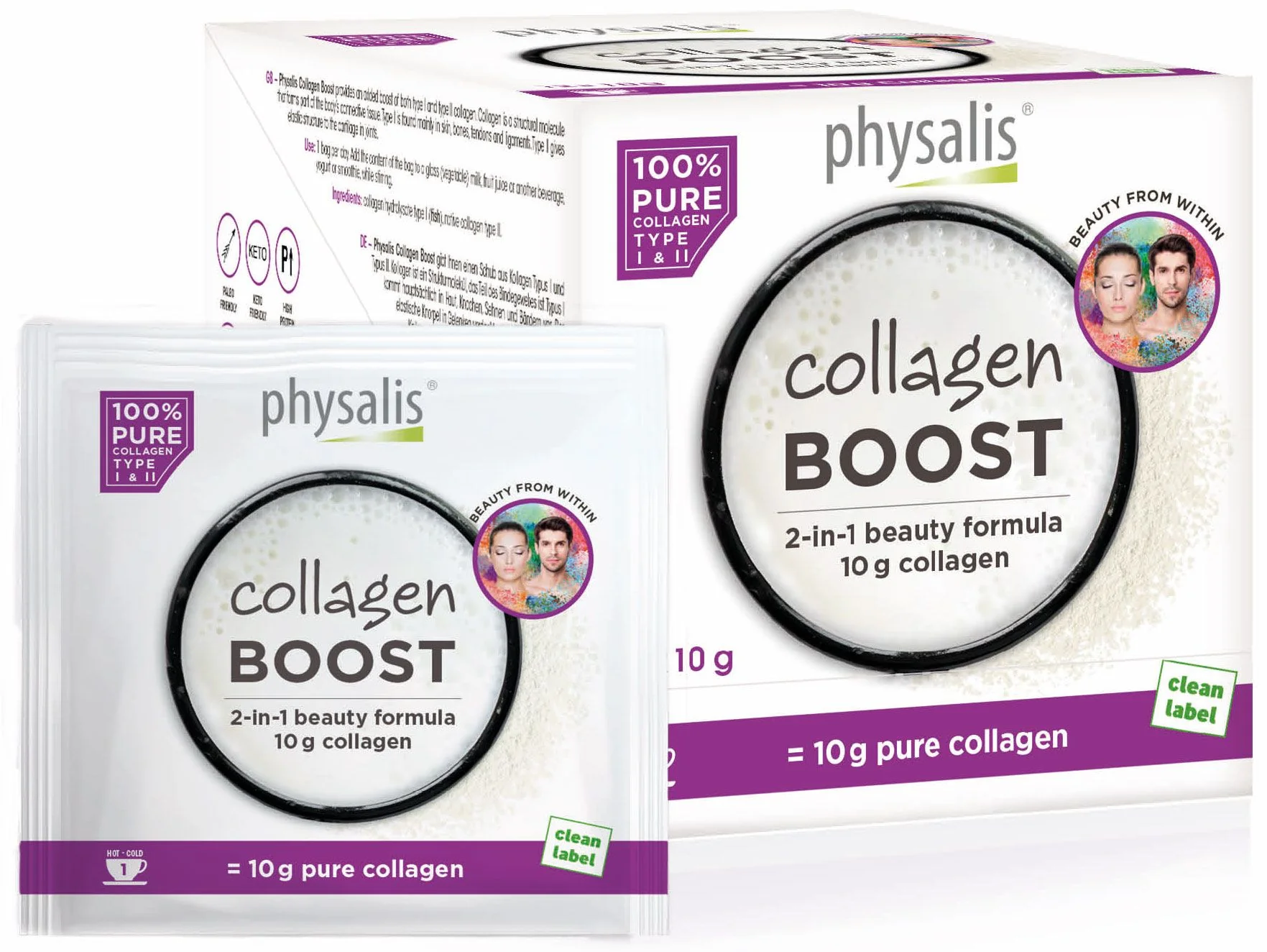 Este producto ha sido especialmente desarrollado para aquellos que buscan el mejor refuerzo de colágeno. El colágeno, el componente principal de nuestros tejidos conectivos, es esencial para preservar la belleza y la firmeza de la piel, pero también es importante como una proteína estructural del cartílago. Collagen Boost contiene dos tipos de colágeno, péptidos de colágeno tipo I (Naticol®) y colágeno nativo (no desnaturalizado) tipo II (b-2Cool®) para una acción triple de alto rendimiento. Por un lado, proporciona péptidos de colágeno, componentes esenciales para su producción y que, por otro lado, permiten que el organismo fabrique más por sí mismo. Finalmente, la ingesta de una dosis baja de colágeno nativo de tipo II significa que el cuerpo degrada menos colágeno endógeno de tipo II, de modo que mantiene más de este componente fundamental a su disposición. Esta combinación de Collagen Boost tiene un efecto sinérgico súper eficiente. Por lo tanto, no es solo una fórmula de belleza para la piel, sino también un producto que fortalece los tejidos conectivos y el cartílago.