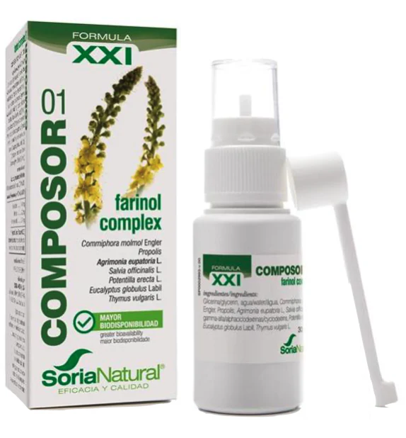 Farinol Complex XXI es una combinación de plantas con acción antiséptica, antiinflamatoria, astringente y antiespasmódica, destinada a ser aplicada en forma de spray en la cavidad bucal para aliviar y tratar procesos como faringitis, amigdalitis, ronquera, encías inflamadas, aftas, úlceras bucales, e irritaciones en los puntos de apoyo de prótesis dentarias.