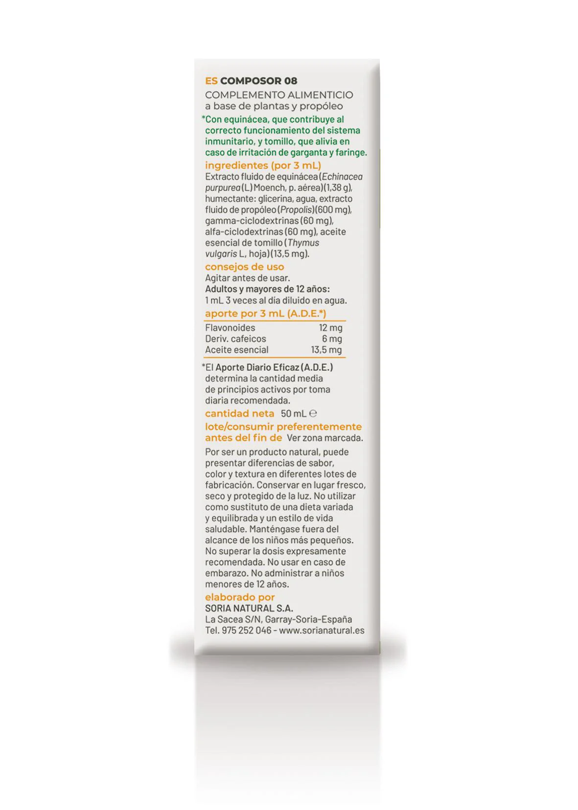 Los principios activos de Composor 08 han sido extraídos con vehículos seleccionados para este caso en particular y asegurando que no generan residuos que pueden ser nocivos para el ser humano. El vehículo de administración de Composor 08 es la glicerina vegetal, que por sus propiedades físicas, actúa como conservante, sin afectar a la integridad química de los componentes del extracto, con lo cual está garantizada una caducidad mínima de tres años, sin que se afecte sensiblemente para la calidad del producto.