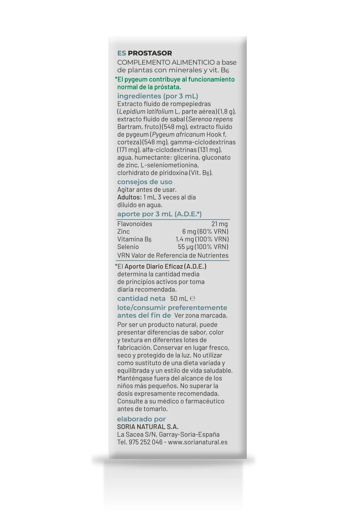 Extracto fluido de rompepiedras (Lepidium latifolium L., parte aérea) (1,8 g), extracto fluido de Sabal (Serenoa repens Bartram, fruto) (548 mg), extracto fluido de Pygeum (Pygeum africanum Hook f, corteza) (548 mg), gamma-ciclodextrinas (171 mg), alfa-ciclodextrinas (131 mg), agua, humectante: glicerina, gluconato de zinc, L-seleniometionina, clorhidrato de piridoxina (vit B6).