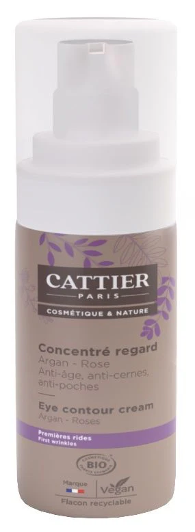 El extracto de cantueso (Lavandula stoechas) actúa eficazmente contra las líneas de expresión gracias a su acción alisante. El agua floral de rosa damascena ecológica calma y refresca la delicada piel de los párpados. Este cóctel de ingredientes activos tonifica el contorno de los ojos, atenúa las bolsas y las pequeñas arrugas e ilumina la mirada.
