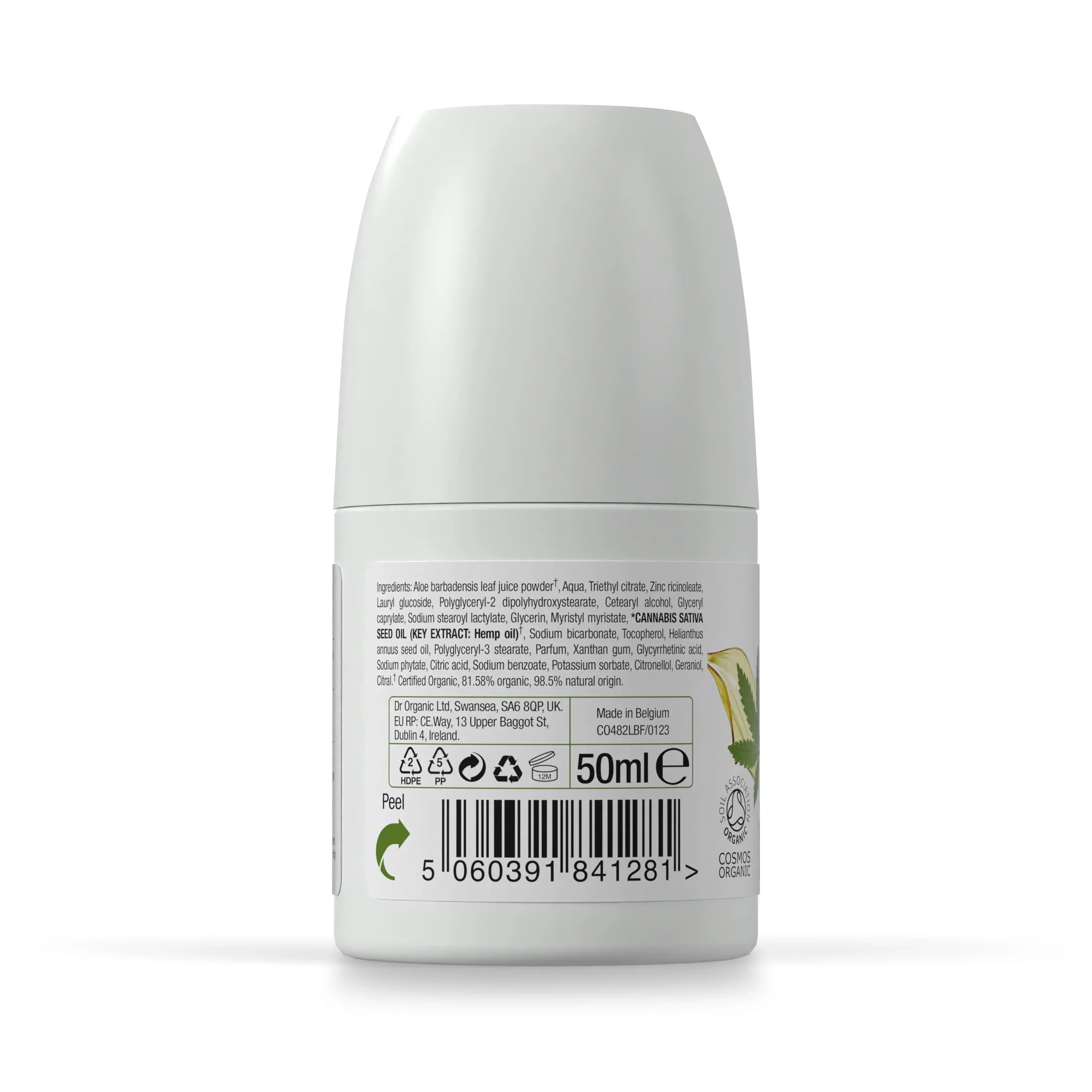 Aloe barbadensis leaf juice, Aqua, Zinc ricinoleate, Triethyl citrate, Lauryl glucoside, Polyglyceryl-2-dipolyhydroxystearate, Glycerin, Cetearyl alcohol, Polyglyceryl-3 stearate, Sodium stearoyl lactylate, Cetraria islandica (Icelandic moss) extract, Cannabis sativa (Hemp) seed oil, Glyceryl caprylate, Isocetyl palmitate, Equisetum arvense (Horsetail) extract, Humulus lupulus (Hop) extract, Hibiscus sabdariffa flower extract, Dipterocarpus turbinatus (Gurjum balsam) oil, Cymbopogon martinii (Palmarosa) oil, Eucalyptus globulus leaf oil, Rosmarinus officinalis (Rosemary) leaf oil, Cinnamomum camphora (Camphor) bark oil, Mentha piperita (Peppermint) oil, Pogostemon cablin (Patchouli) oil, Pelargonium graveolens (Geranium) oil, Vetiveria zizanoides (Vetiver) root oil, Citrus limon (Lemon) peel extract, Cupressus sempervirens (Cypress) seed extract, Litsea cubeba (May chang) oil, Lavandula hybrida (Lavender) oil, Glycyrrhetinic acid, Sodium bicarbonate, Tocopherol, Helianthus annuus (Sunflower) seed oil, Chondrus crispus (Carrageenan) extract, Xanthan gum, Sodium phytate, Phenoxyethanol, Sodium benzoate, Potassium sorbate, Citric acid, Citral, Citronellol, Limonene, Farnesol, Geraniol, Linalool.