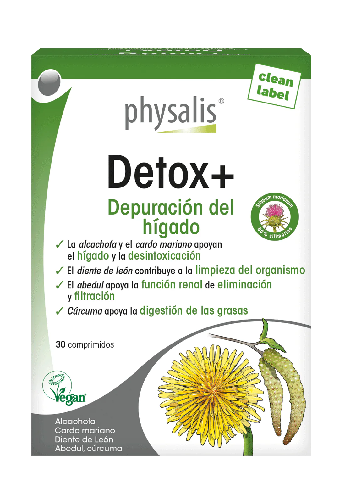 Nuestro organismo y en especial el hígado, a menudo está sometido a duras pruebas a causa de que comemos demasiado y demasiado graso, consumimos alcohol, café, alimentos refinados, sin hablar de la polución medioambiental… Physalis Detox+ es un complejo sinérgico de principios activos de plantas como la alcachofa y el cardo mariano (silimarina) que apoya al hígado en su función depurativa y desintoxicante. El abedul contribuye a la acción filtrante y eliminadora de los riñones. El diente de león contribuye a un buen estado general del intestino por su efecto drenante de la bilis y su influencia positiva en la flora intestinal (prebiótico). El extracto de cúrcuma apoya igualmente el mantenimiento de la función hepática y la buena digestión de las grasas. El complejo de curcumínoídos (Longvida ) que ha sido objeto de numerosos estudios y de una patente, es 95 veces mejor asimilada que la curcumina bajo la forma standard.
