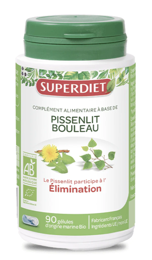 Diente de león* (raíz) (polvo y extracto [soporte: maltodextrina*]) 900 mg, cápsula de gelatina de pescado* (vinagre de alcohol*, sirope de glucosa*, antiaglomerante: lecitina de soja*, aceite de colza*) , abedul blanco* (hoja) 300 mg, almidón de arroz*, antiaglomerante: talco. * Ingrediente procedente de la agricultura biológica.