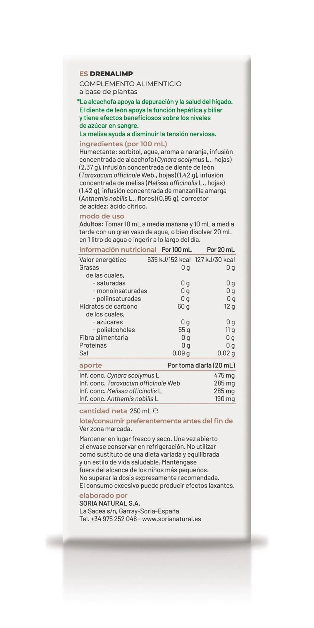 Su composición con plantas naturales medicinales hacen de Drenalimp una bebida drenante y adelgazante. Actúa favoreciendo la eliminación de la sobrecarga de toxinas y evitando que se acumule la grasa.