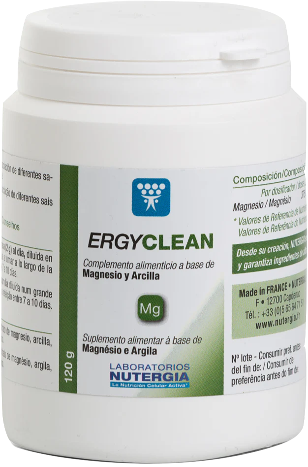 Ergyclean está compuesto por sales de magnesio en sus diferentes formas (carbonatos, citratos y sulfatos) junto con arcilla. Esos ingredientes son conocidos como suaves laxantes.