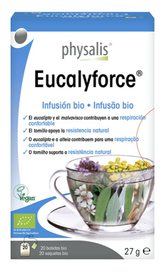Heladas, viento, lluvia, contaminación,… Nuestras vías respiratorias están sometidas a menudo a duras pruebas. Physalis Eucalyforce® infusión de plantas biológicas contiene eucalipto y malvavisco que contribuyen a una respiración confortable y tomillo que apoya la resistencia natural. Delicioso en una fría noche de invierno, con o sin miel.