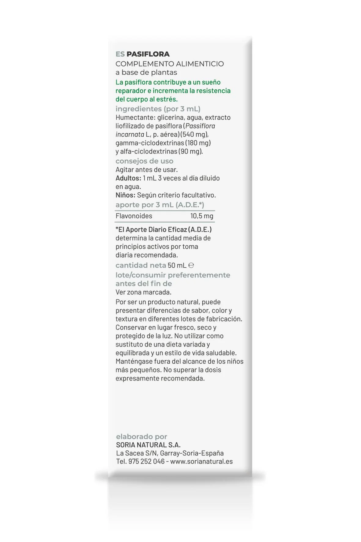 Humectante: glicerina, agua, extracto liofilizado de pasiflora (Passiflora incarnata L, P. aérea) (540 mg), gamma-ciclodextrinas (180 mg) y alfa-ciclodextrinas (90 mg).