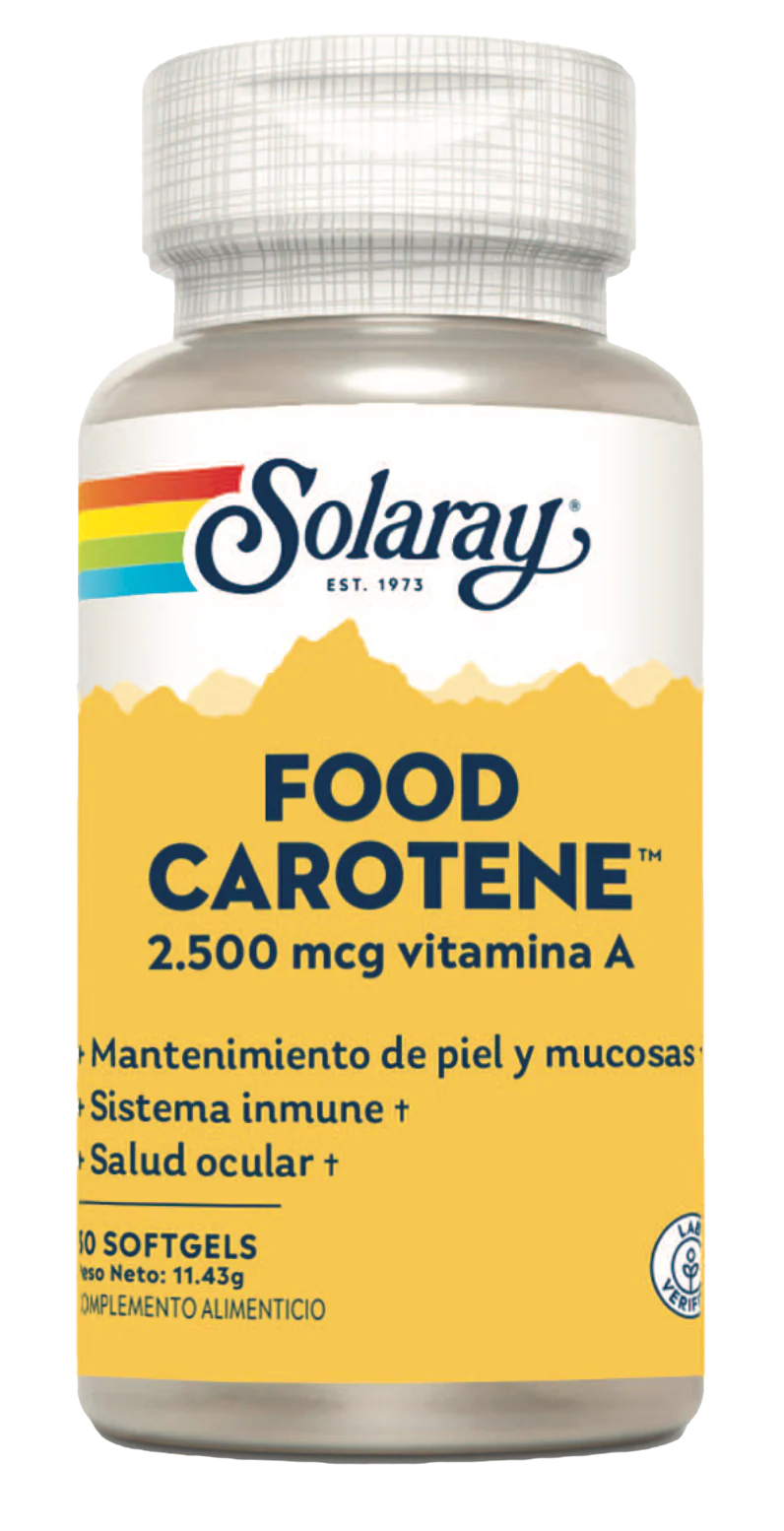 Food Carotene es un complejo altamente avanzado que aporta vitamina A procedente del alga Dunaliealla salina en una dósis mínima de 25.000 UI, reforzado con carotenoides procedentes de alimentos.