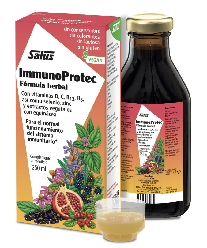 ImmunoProtec está elaborado a base de una asociación de extractos acuosos entre los que destaca la equinácea, zumos de frutas, así como micronutrientes que contribuyen al funcionamiento normal del sistema inmunológico.