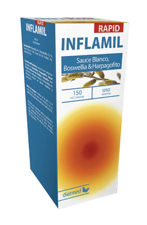Inflamil Crema es un producto con extractos naturales de Boswellia, Harpago, Sauce Blanco, Reina de los Prados y Alcanfor, conocidos y utilizados en emplastos desde la antigüedad, poseen un efectos sedativo y calmanete de los estados reumáticos.