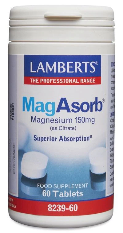 Desafortunadamente, todavía existen muchos complementos de magnesio que no aportan ni siquiera niveles cercanos a esto. MagAsorb® de Lamberts® proporciona 150 mg de magnesio por tableta. Usamos específicamente magnesio en forma de citrato, ya que es la forma más fácilmente absorbida por nuestro organismo y que dispone de abundantes estudios científicos que apoyan su uso.