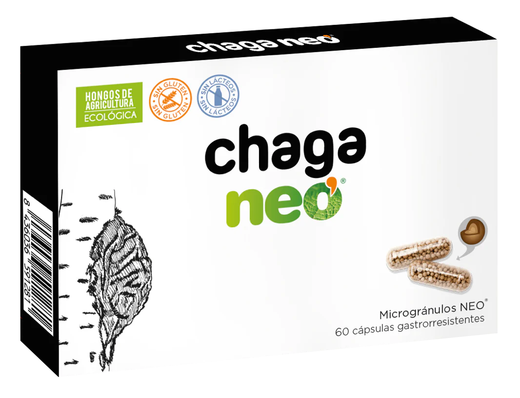 Chaga Neo se obtiene a partir de extracto puro de Inonotus obliquus, de producción ecológica, libre de maltodextrinas y alérgenos. Se presenta en cápsulas gastrorresistentes, que permiten proteger los activos del hongo del medio ácido, además de mejorar su biodisponibilidad gracias a la galénica en microgránulo, una avanzada tecnología que optimiza, protege y modula la liberación de los principios activos. En su fabricación, se incorpora vitamina C natural, obtenida de la especie camu-camu (Myrciaria dubia), en la cubierta exterior del microgránulo. Gracias a ello, la vitamina C se libera inmediatamente antes que los activos del hongo, de manera que se favorece la absorción de los polisacáridos y optimiza su acción fisiológica.
