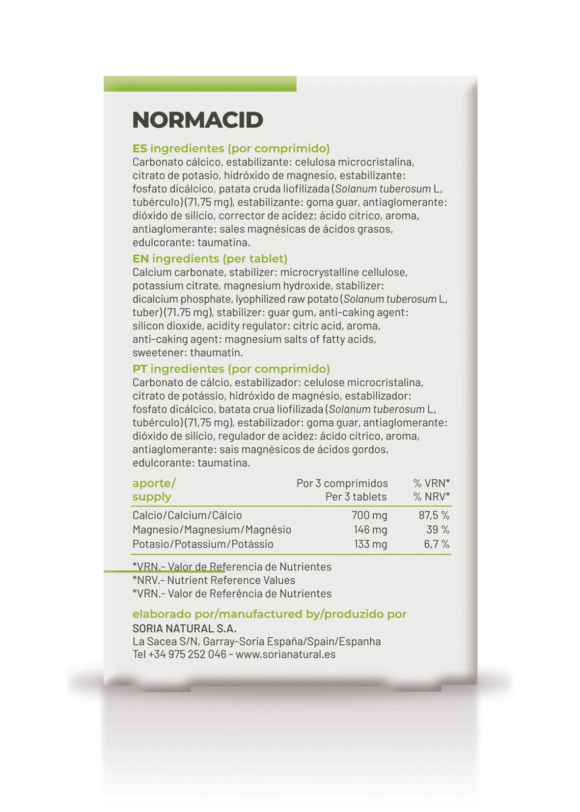 Normacid es un complemento alimenticio sin aluminio, elaborado a base de sales minerales (calcio, magnesio, potasio) y patata liofilizada, que ayuda a neutralizar rápidamente la acidez excesiva y la sensación de pesadez. Se aconseja también para aliviar rápidamente las molestias asociadas al consumo excesivo de comidas grasas, tabaco, alcohol, comidas de negocios, ajetreado ritmo de vida, etc.