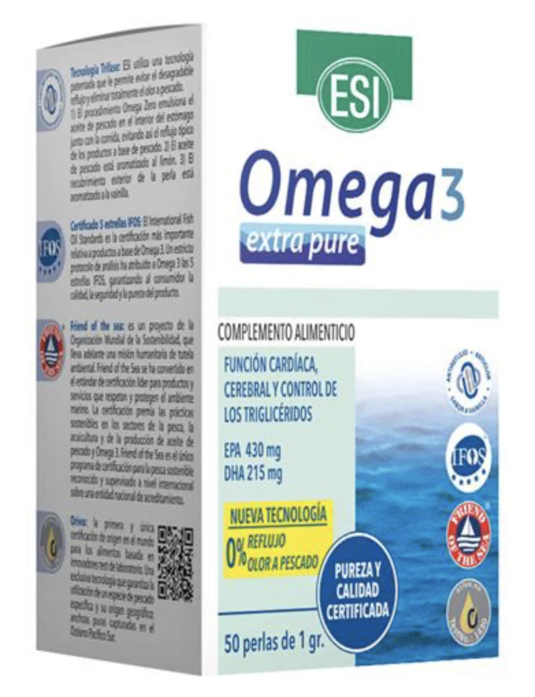 Suplemento a base de aceite puro concentrado de pescado (procedente del océano pacífico) rico en ácidos grasos poliinsaturados de la serie Omega 3, estandarizado y altamente concentrado con propiedades beneficiosas para la salud cardiovascular y la función cerebral. El producto se presenta en forma de perlas con una tecnología antirreflujo. La alta concentración y pureza está abalada por la certificación 5 estrellas IFOS que garantiza la calidad, seguridad y pureza del producto. Omega 3 extra pure se presenta en forma de ácidos grasos libres naturales. No contiene dioxinas ni metales pesados.