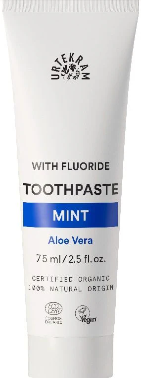 Gracias a la nueva norma de Cosmos Bio se ha podido introducir el fluoruro de sodio en este producto. Esta pasta de dientes de Urtekram contiene menta y fluoruro para proteger de manera natural y ofrece un aliento fresco.