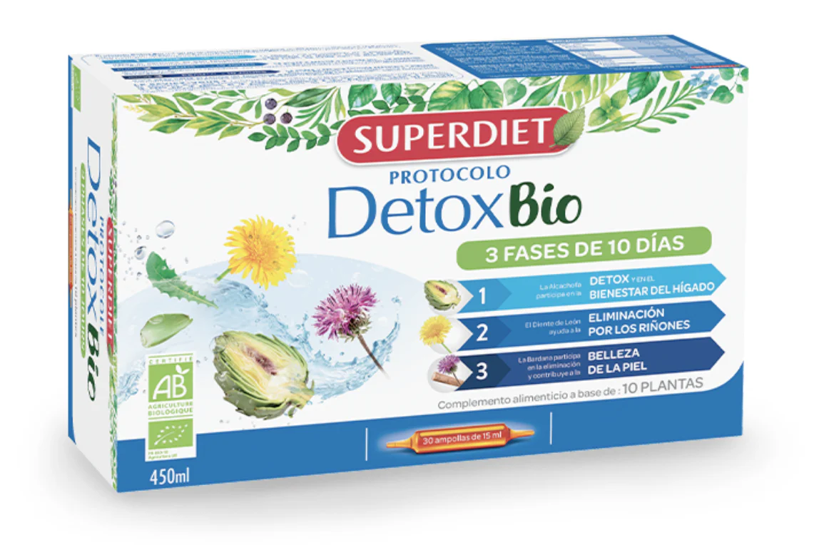 Protocolo Detox Bio es un programa focalizado y progresivo de 30 días que se desarrolla en tres fases sucesivas de 10 días. Estos tres complejos de plantas Bio están formulados según los principios de la naturopatía a base de plantas seleccionadas por los Laboratorios Superdiet.