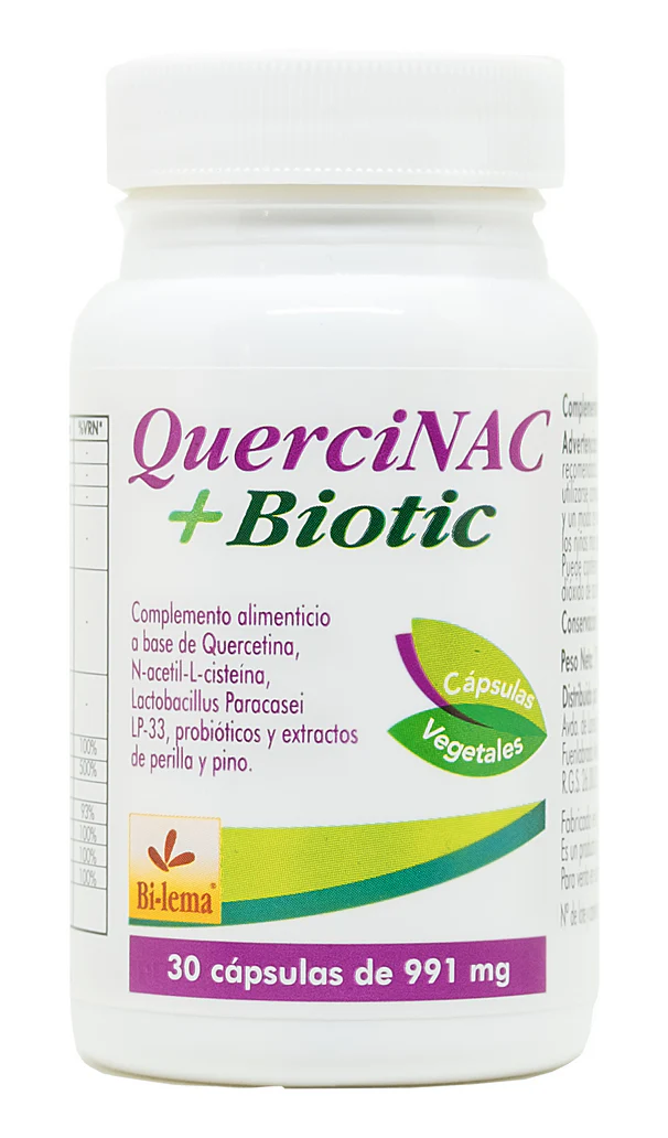 Quecetina 330 mg. N-acetil-L-cisteína (NAC) 299 mg. Lactobacillus Paracasei LP-33 75 mg (1 x 1011 CFU) Probióticos 50 mg (1 x 1010CFU) (Lactobacillus acidophillus, bifidobacterium longum, bifidobacterium bifidum y bifidobacterium lactis) Extracto seco Perilla 50 mg. (Perilla frutescens (L.) Britton,semillas) Extracto seco Pino marino 30 mg. (Pinus massoniana Lamb., corteza 95% Proantocianidinas) Niacina 16mg. (nicotinamida) Vitamina D 25mcg. (colecalciferol 1000UI) Vitamina B6 1,3 mg.(clorhidrato de piridoxina) Vitamina B2 1,4 mg. (riboflavina) Vitamina B1 1,1 mg. (clorhidrato de tiamina) Vitamina B12 2,5 mcg. (cianocobalamina) Cápsula vegetal gastrorresistente.