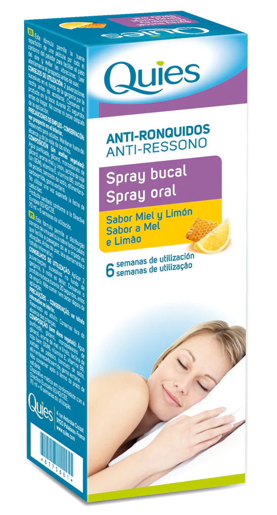 El spray antirronquido Quies actúa directamente sobre las causas del ronquido: gracias a la goma xantana, lubrica el velo del paladar, evitando así las vibraciones en el momento de la respiración. Formulados sin aceites vegetales, sus activos mantienen un buen grado de humedad en el fondo de la garganta durante toda la noche.