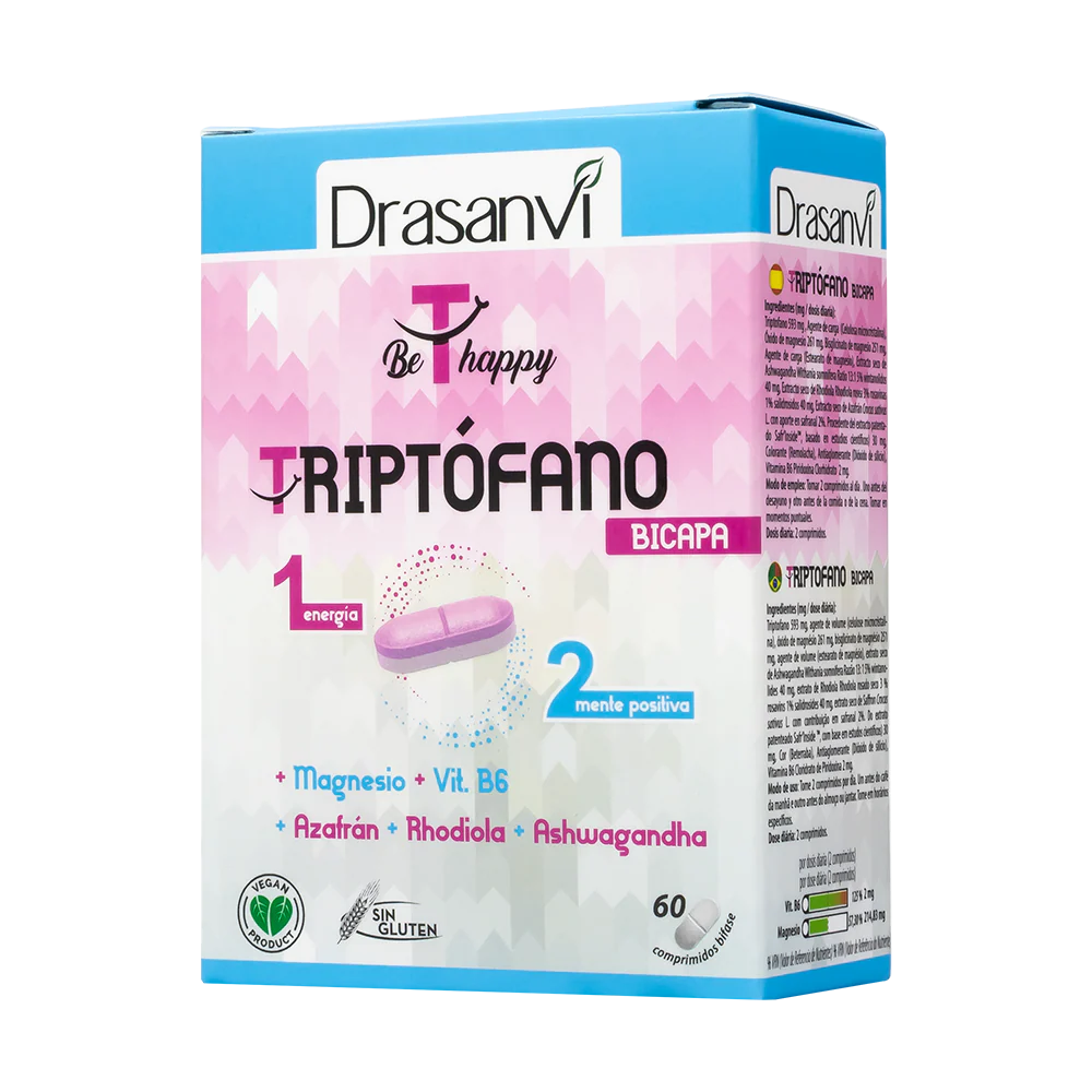 L-Triptofano 593 mg, Agente de carga (Celulosa microcristalina), Óxido de magnesio 261 mg, Bisglicinato de magnesio 251 mg, Agente de carga (Estearato de magnesio), Extracto seco de Ashwandha (Withania somnifera Ratio 13:1 5% wintanolidos) 40 mg, Extracto seco de Rhodiola (Rhodiola rosea 3% rosavinas 1% salidrosidos) 40 mg, Extracto seco de Azafran (Crocus sativus L. con aporte en safranal 2%. Procedente del extracto patentado Safr’InsideTM, basado en estudios científicos) 30 mg, Colorante (Remolacha), Antiaglomerante (Dióxido de silicio), Vitamina B6 (Piridoxina Clorhidrato) 2 mg.