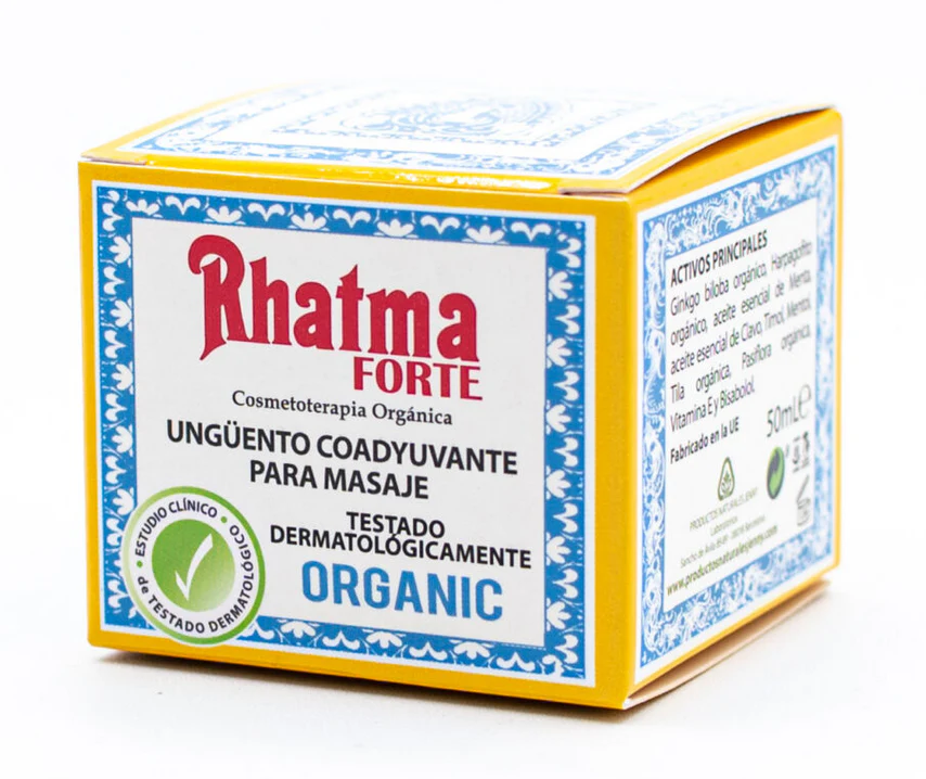 Rhatma Forte es un ungüento balsámico compuesto por una alta concentración de principios activos vegetales. Está indicado para aquellos casos de rigidez de los músculos, contracturas musculares, esguinces, fracturas, torceduras, inflamaciones, golpes, dolores musculares tras un esfuerzo deportivo, articulaciones dislocadas: hombros, brazos…